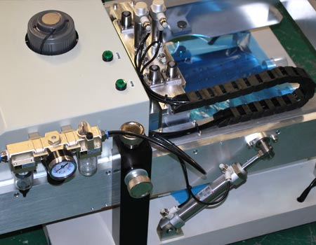 T1100模板支架的升降及刮刀的起落使用氣缸驅(qū)動(dòng),各氣缸的進(jìn)、排氣口裝有速度控制閥,可方便的調(diào)整氣缸運(yùn)動(dòng)速度;