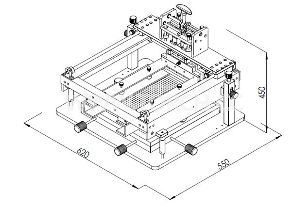 本機x、y、z和角度四軸都可以精密調整,通過調整四軸實現(xiàn)PCB板上的焊點和固定于模板框架上的模板相應開孔坐標的一一對應,并通過平臺的上升下降調整PCB和模板之間的距離。