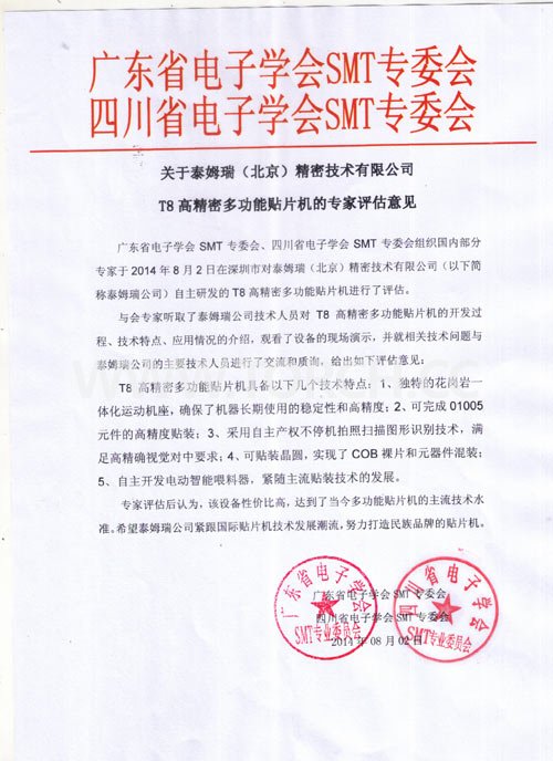 多功能貼片機T8是泰姆瑞自主研發(fā)設(shè)計的一款多功能視覺貼片機,可以貼裝01005元件。在2014深圳電子裝備展進行展出,并備受行業(yè)專家關(guān)注。經(jīng)過廣東省電子學(xué)會、四川省電子學(xué)會多位知名SMT專家的聯(lián)合評審、檢測,給出了以下評估意見: