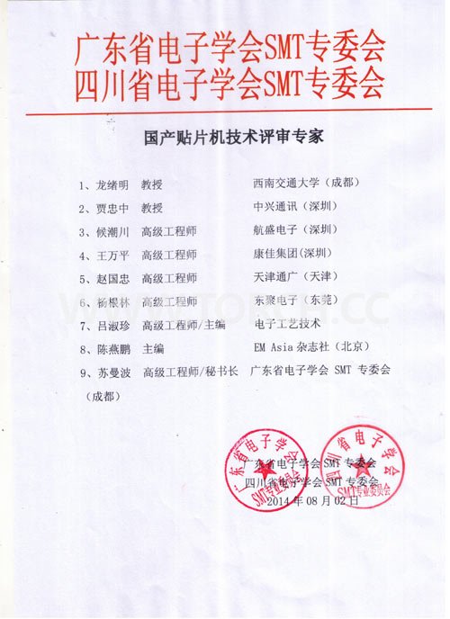 專家評估意見:該設(shè)備性價比高,達到了當(dāng)今多功能貼片機的主流技術(shù)水準,希望泰姆瑞公司緊跟國際貼片機技術(shù)的發(fā)展,努力打造高質(zhì)量貼片機,成為真正的成長型企業(yè)貼片機的品牌。