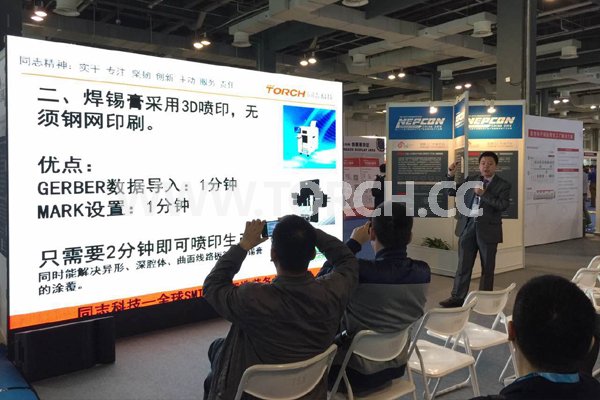 “NEPCON 與智慧工廠 1.0-電子制造的未來”主題研討會(huì)現(xiàn)場照片,圖片是北京中科同志科技股份有限公司總經(jīng)理趙永先先生在做“柔性電子制造SMT生產(chǎn)線”的演講!