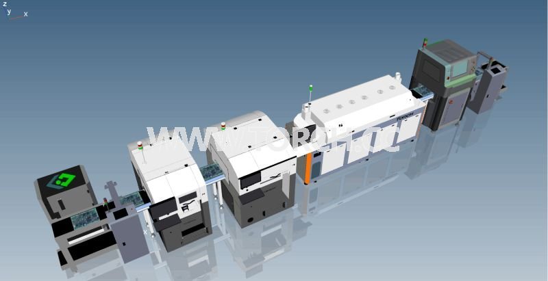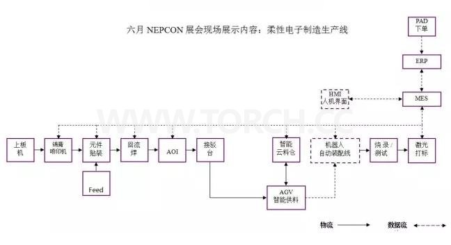 現(xiàn)場將演示在 MES控制下所有設(shè)備(自動上料機→焊膏噴印機→智能貼片機→再流焊機→AOI→ICT→自動組裝設(shè)備→自動功能測試設(shè)備→自動料倉)的協(xié)同工作以及3D仿真的虛擬工廠。