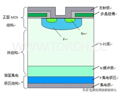 IGBT(真空共晶爐)芯片在結(jié)構(gòu)上是由數(shù)萬個元胞(重復(fù)單元)組成,工藝上采用大規(guī)模集成電路技術(shù)和功率器件技術(shù)制造而成[2]。每個元胞結(jié)構(gòu)如下圖2所示,可將其分成體結(jié)構(gòu)、正面MOS結(jié)構(gòu)及背面集電極區(qū)結(jié)構(gòu)三部分。