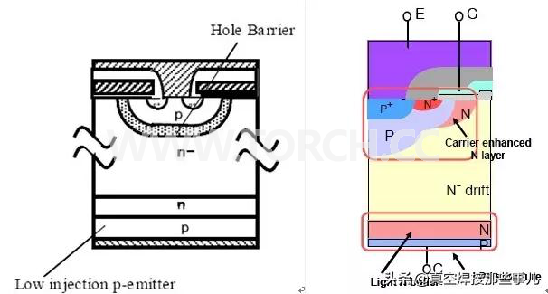 IGBT的集電極區(qū)結(jié)構(gòu)影響著PNP晶體管的增益,對正向壓降與關(guān)斷損耗都有重要的影響。早期的穿通型IGBT其集電極區(qū)結(jié)深較大,空穴注入效率很大,容易發(fā)生閂鎖效應(yīng),必須采用局部壽命控制技術(shù)來控制背部空穴注入效率,但是卻因此面導(dǎo)致了導(dǎo)通壓降的負溫度系數(shù),不利于并聯(lián)應(yīng)用。后來出現(xiàn)的非穿通型IGBT,采用了透明集電極結(jié)構(gòu),