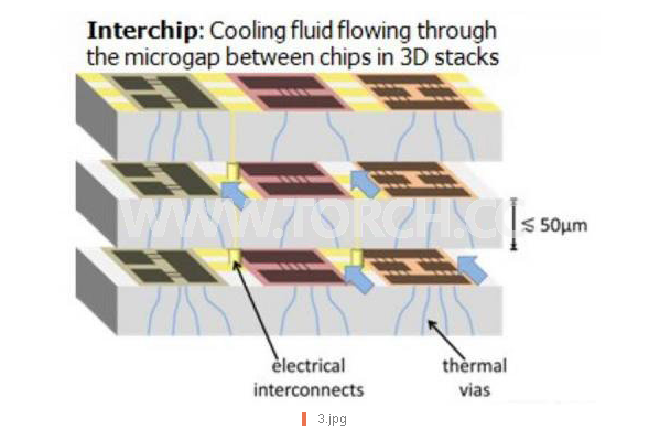 冷卻具有絕緣介電質(zhì)流體的3D芯片堆疊時,該絕緣介電質(zhì)流體沸騰成蒸汽,并從間隔100微米距離的50微米堆疊中提取熱,使裸金屬通孔可在芯片之間運行,如同水冷卻劑一樣形成互連而不至于造成短路。